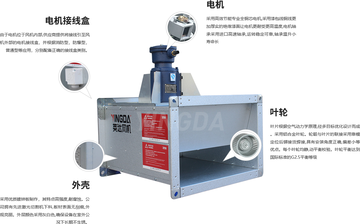 由(yóu)於電機位於風機內部,供應商(shāng)應提供將接線引至風機外部的電機接線盒,並根據消防型、防爆型(xíng)、普通型等應(yīng)用,分別配備正確的接線(xiàn)盒類型。
