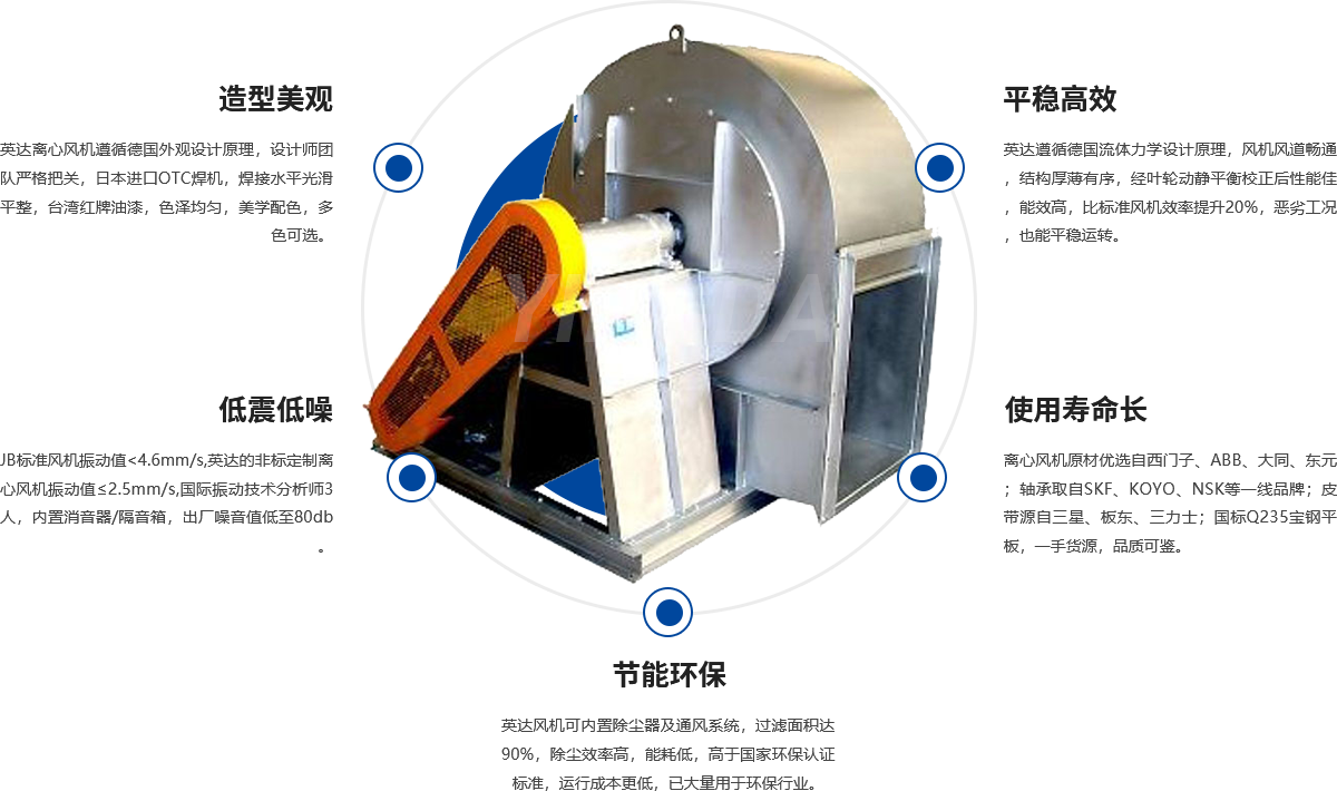 風機葉輪、機殼可選用優質Q235碳鋼,304不鏽(xiù)鋼,玻(bō)璃鋼纖(xiān)維,全部模具化生產,采用電焊、手段,表麵清潔平整、不存在焊(hàn)接變形現象,葉輪經動、靜平衡校正,其平衡精度不大於4.0級。