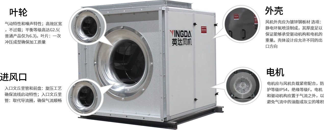 電機應與風(fēng)機負載緊密(mì)配合,防護等級IP54,絕緣等級F。電機和驅動機構應置於氣流之外,以避免氣流中(zhōng)的油脂或灰塵的堆積。