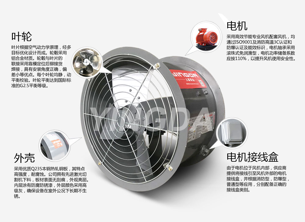 為適應防爆環境需要,風機可做成防爆風機,防爆等級(jí)為EXdⅡBT4,適用於易燃、易爆氣體的場所。整機(jī)通過國家防爆認證。